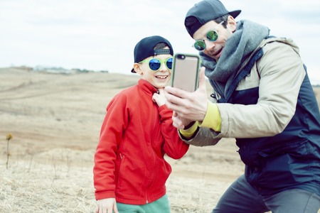 young father with his son having fun outside in spring field, happy family smiling, lifestyle people making selfie wearing sunglasses