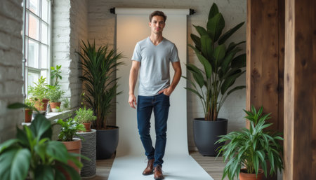 A stylish young man confidently walks down a minimalist runway surrounded by lush greenery and natural light. His casual outfit and relaxed demeanor create a fresh and modern vibe, perfect for showcasing contemporary fashion.