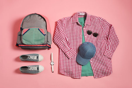 Top view fashion trendy look of kids clothes. Kids fashion. Spring, autumn outfit
