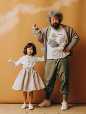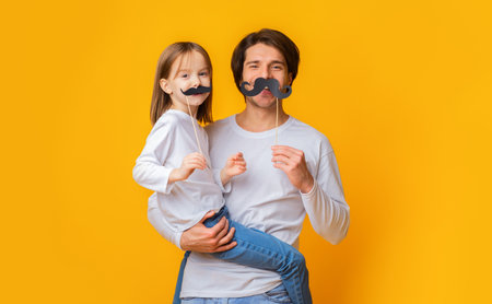 Generative AI : happy fathers day funny dad and daughter with mustache fooling around on colored yellow background