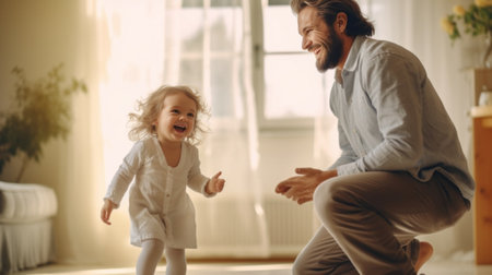 Feeling proud for his daughter Young father looking at his little daughter and smiling while she jumping in bedroom : Generative AI