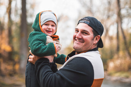 Cute toddler boy in his fathers arms. Dad and son having fun on sunny autumn day. Adorable son being held by his daddy.