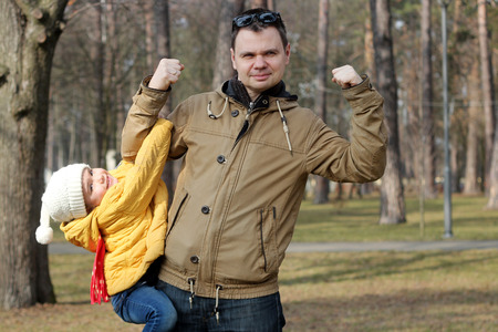Middle-aged man holding his arm up to show how strong he and her little daughter hanging on her biceps, spring park activity, happy family concept, outdoor portrait