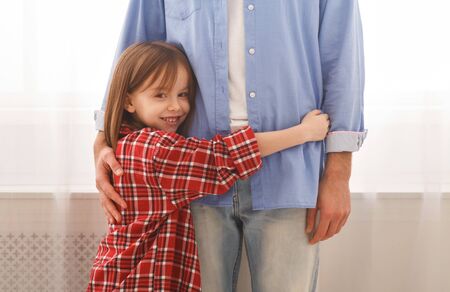 You are my hero. Cute smiling little girl hugging her dad at home, staying next to window, close up