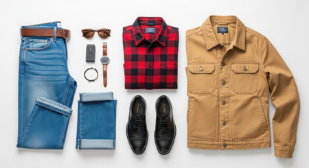 Different styles of shirts, pants, and accessories displayed on a clean white background, offering space for text or branding.