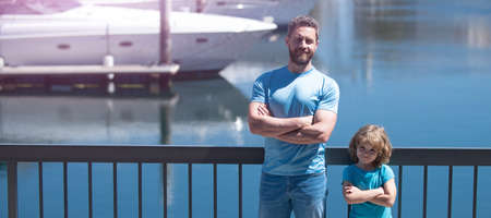 Banner of father man and son child stand on quay railing keeping arms crossed with confidence, fathers day