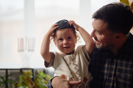 Caucasian man holding toddler adjusting kippah while smiling indoors, menorah visible in background, celebrating Hanukkah together, natural daylight illuminating scene