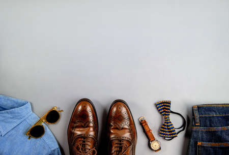 Men Clothes, Father Day Concept. Vintage Style. Flat Lay on Light Grey Background. Included Wingtips Dress Shoes, Hand Watch, Bow Tie, Shirt, Jeans and Sunglasses . Stylish Men. Top View
