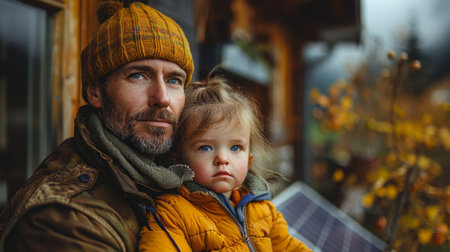 Solar panels on the roof of the house of a father and his little girl. Alternative energy, conserving resources, and sustainable lifestyles.