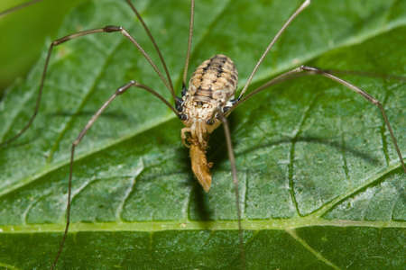 Macrophotography of a Harvestman spider (Phalangium opilio) on green leaf.