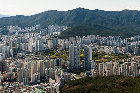 Busan city panorama beautiful skyline view from Hwangnyeongsan mountain observatory, sunny day