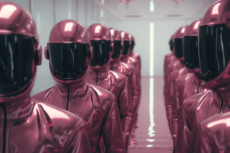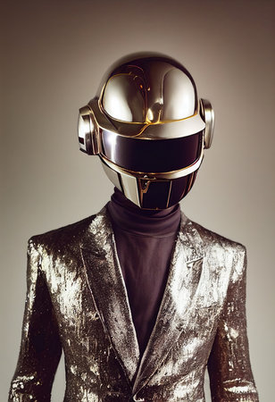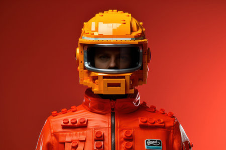 a man in suits and a helmet stands confidently in front of a retro futuristic brown background. the ambient occlusion effect adds depth to the image, while the use of a minolta riva mini camera captures the smooth and shiny details. the overall aesthetic is iconic and pop-inspired, creating a visually striking composition. ai generated