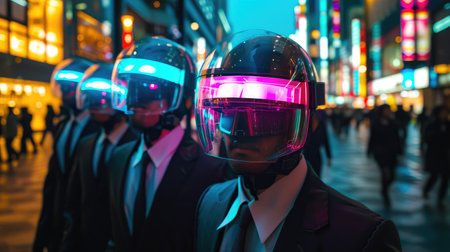 Neon-Lit Group in VR Helmets at Night