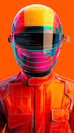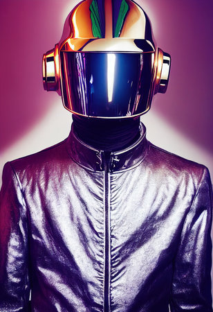 Striking pink and yellow backdrop with bold figure clad in futuristic pink attire and sleek yellow helmet. Perfect blend of style and mystery