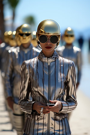 a woman wearing a shiny silver jacket and sunglasses with gold helmets