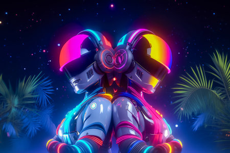 Beautiful female dancers wearing glowing robot helmets enjoy a vibrant dance party. Neon lights illuminate the scene with palm trees on background.