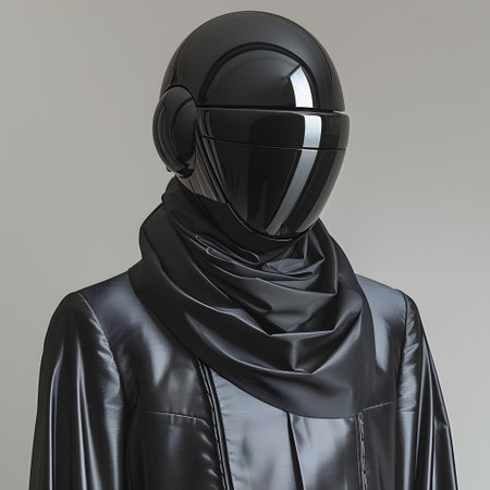 Fashion design mannequin in grey sleeve and black helmet with scarf