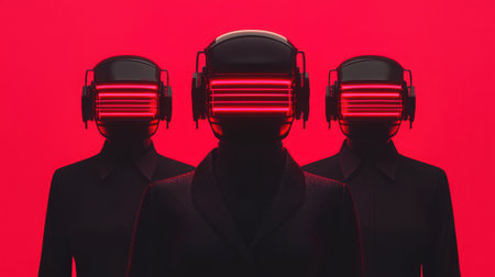 This striking digital artwork showcases three mysterious figures wearing neon headsets, set against a vibrant red backdrop, capturing themes of technology and futurism.