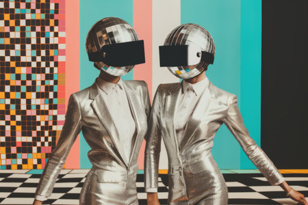 Two men are sitting on a sofa with disco balls covering their heads, creating a surreal and humorous scene. Ai generated image
