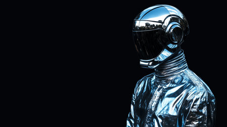 Figure in advanced space like helmet with illuminated visor on dark background, representing future, technology, and adventure