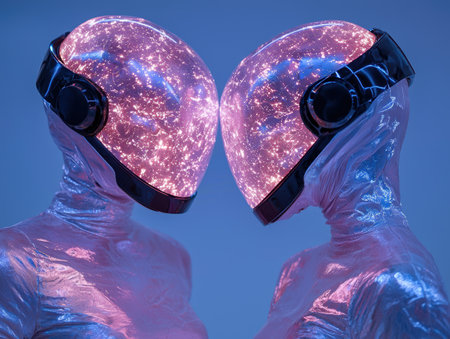 Futuristic robots with glowing helmets face each other