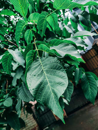 Closeup tropical nature view of Ylang-Ylang green leaf with rain drop after rain fall