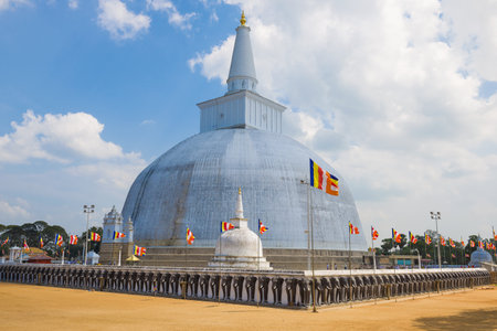 Anuradhapura, Sri Lanka - August 16, 2017: View of Ruwanwelisaya stupa, a hemispherical structure containing relics. The stupa is one of the world's tallest monuments, standing at 103 m (338 ft)