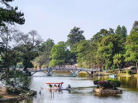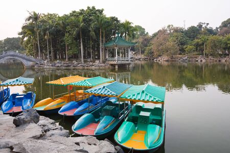 Boat on the lake in the park with blue sky background.