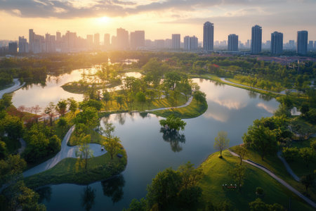 A stunning urban park with vibrant greenery set against a bustling city skyline, showcasing nature's beauty in a tranquil outdoor space with pathways and people enjoying leisure activities.