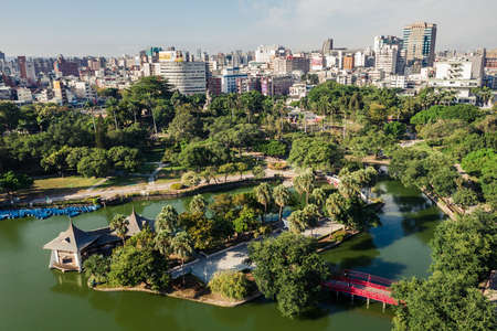 Taichung, Taiwan - November 21th, 2019: cityscape with trees in Taichung Park at Taichung City, Taiwan, Asia