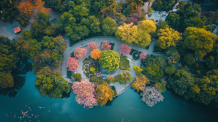 Aerial view of the lake with colorful flowers in the park.