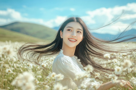 A beautiful Asian woman with long hair, wearing white and smiling happily as the wind blows across her face, is running through tall grass and flowers. The background features distant mountains under a blue sky. The full-body photograph captures the natural light, using a wide-angle lens, and is full of vitality. --ar 3:2 --v 6.1 Job ID: 0a442238-88df-4b5e-bac5-f0329c0ab5e6