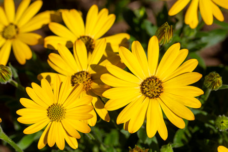 Bright african yellow daisies flourish in a verdant garden, displaying intricate petal details and lush greenery, evoking a sense of joy and natural beauty