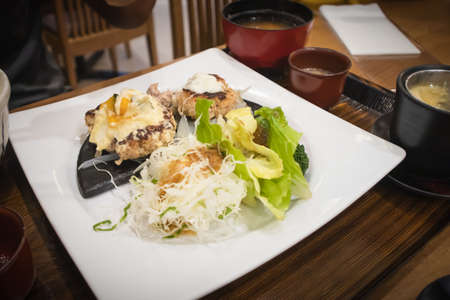 Traditional japanese street food lunch set with rice meat fish and vegetable fruit salad and miso soup and side dish in local restaurant cafe shop for travelers people eat drink at Tokyo city in Japan