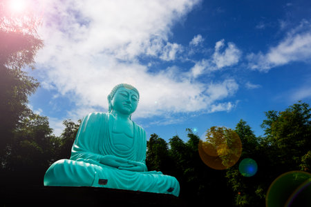 The serene Buddha statue is set against a backdrop of a bright blue sky, creating a sense of peace and tranquility