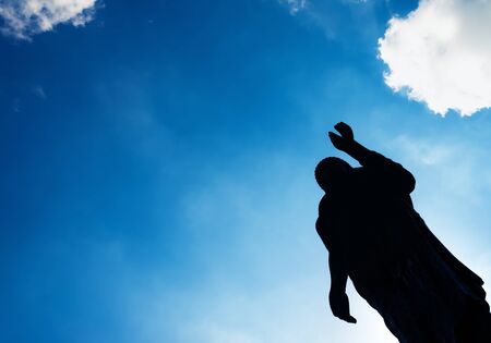 Buddha statue ok sign post bottom view with dark silhouette with deep clear blue sky with few clouds and white light glowing