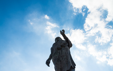 Buddha statue buddha image used as amulets of Buddhism religion in Thailand. Standing golden Buddha and the blue sky. (Top View)