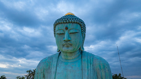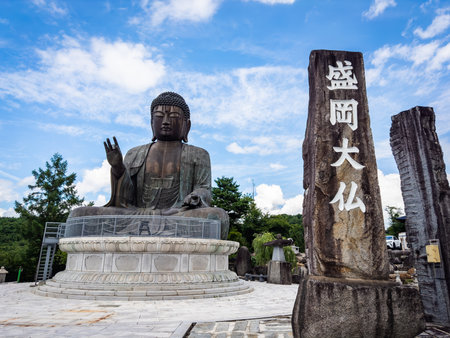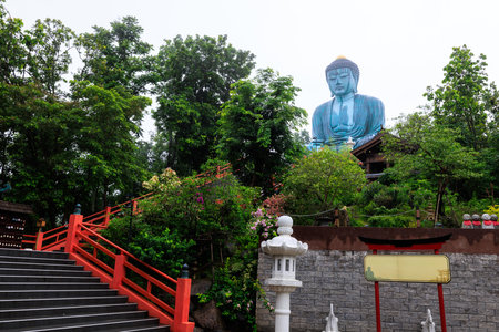 The Big Buddha at Seiryuji Temple in Aomori Prefecture. AOMORI, JAPAN - APRIL 24 2018: The big Buddha at Seiryuji temple completed in 1984, the bronze Buddha with meditation posture is totally 21.35 meters tall