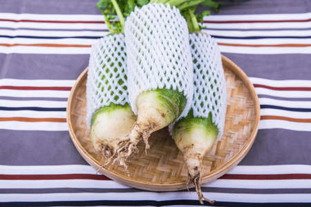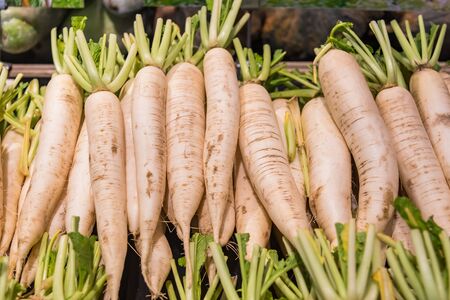 Fresh organic chinese radish or Raphanus sativus Linn sale in urban market.