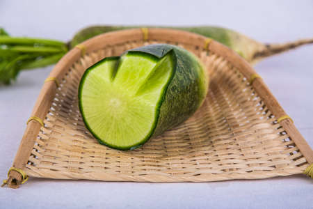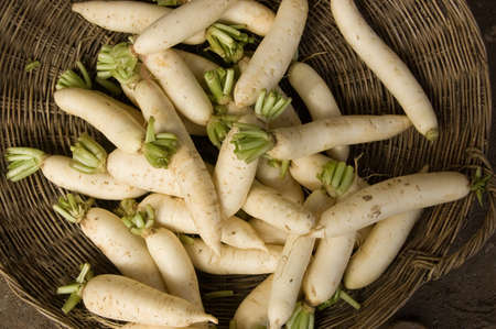 Daikon Radish with Greens in a Woven Basket, Fresh from the Farm