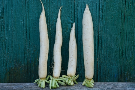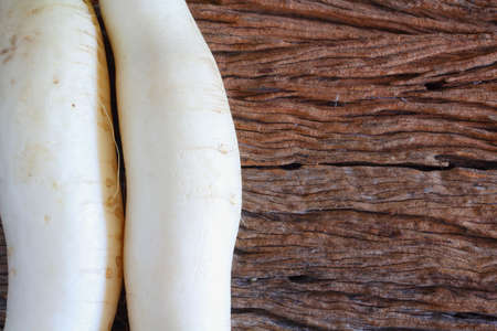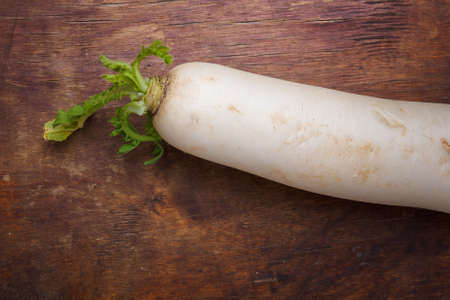 Daikon, east long white radish on brown background. Fresh organic vegan farm vegetables, seasonal harvest, healthy food.