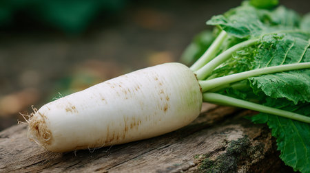 Daikon radish resting gracefully on rustic wood with vibrant green leaves.