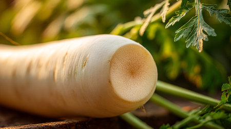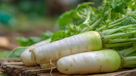 Fresh Daikon Radish Displayed on Rustic Wood with Lush Greenery