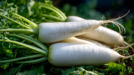 Freshly Harvested Daikon Radishes Displayed in Natural Light, With Green Foliage