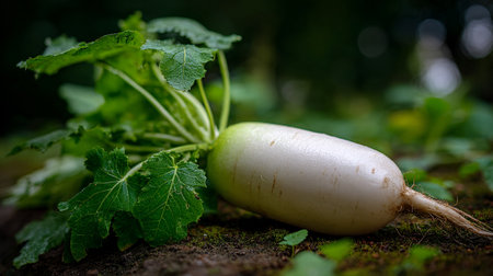 Fresh Daikon Radish with Lush Greenery Resting on Mossy Ground Outdoor