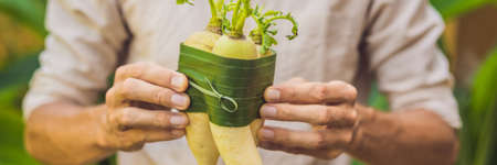 Daikon wrapped in a banana leaf, as an alternative to a plastic bag.