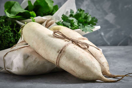 Daikon radish on concrete background with space for text. Natural products, gray background
