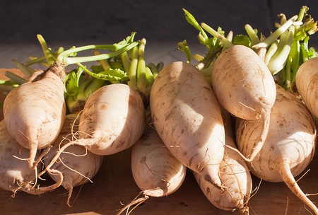 Close-up on a stack of daikon radishes for sale on a market stall.