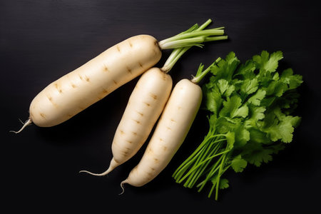 Fresh Daikon Radishes Displaying Their Clean White Roots and Green Leafy Tops