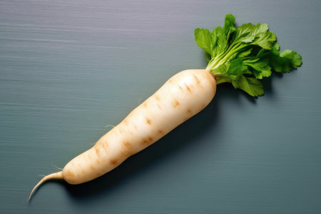 Fresh daikon radish with vibrant green leaves on a rustic surface.